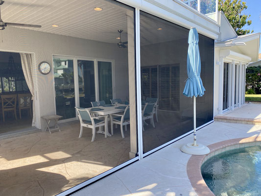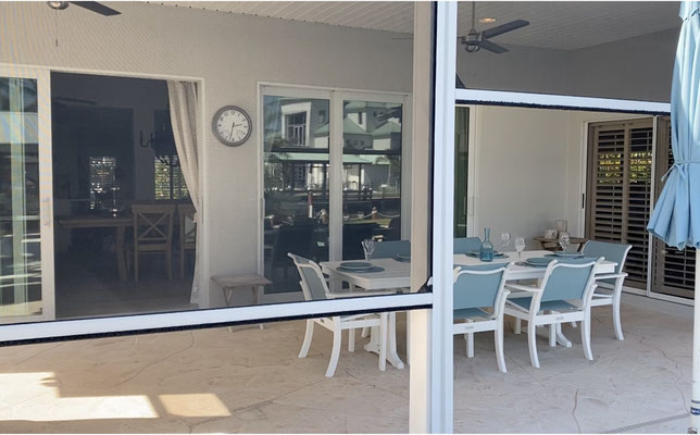 Our terrace and outdoor area were deliberately designed with an open layout to create a pleasant pool deck, which is why we chose not to install a cage. The proximity to the beach almost always provides a refreshing breeze. If the wind calms down at dusk and insects appear, electric mosquito screens can be lowered around the covered terrace — allowing you to enjoy peaceful evenings outdoors without any disturbance.