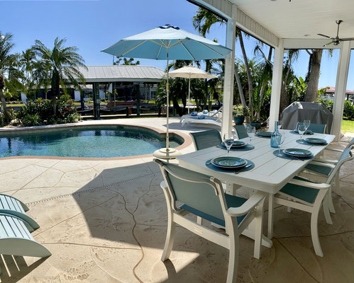 Relax on our covered terrace and let the gentle breeze soothe you while you take in the beautiful water views. For lively evenings, our barbecue grill is at your disposal. Enjoy unforgettable hours of sunshine under the palm trees surrounding our magnificent, refreshing saltwater pool. Or unwind with a cocktail on the boat dock, seated in our classic Floridian Adirondack chairs.